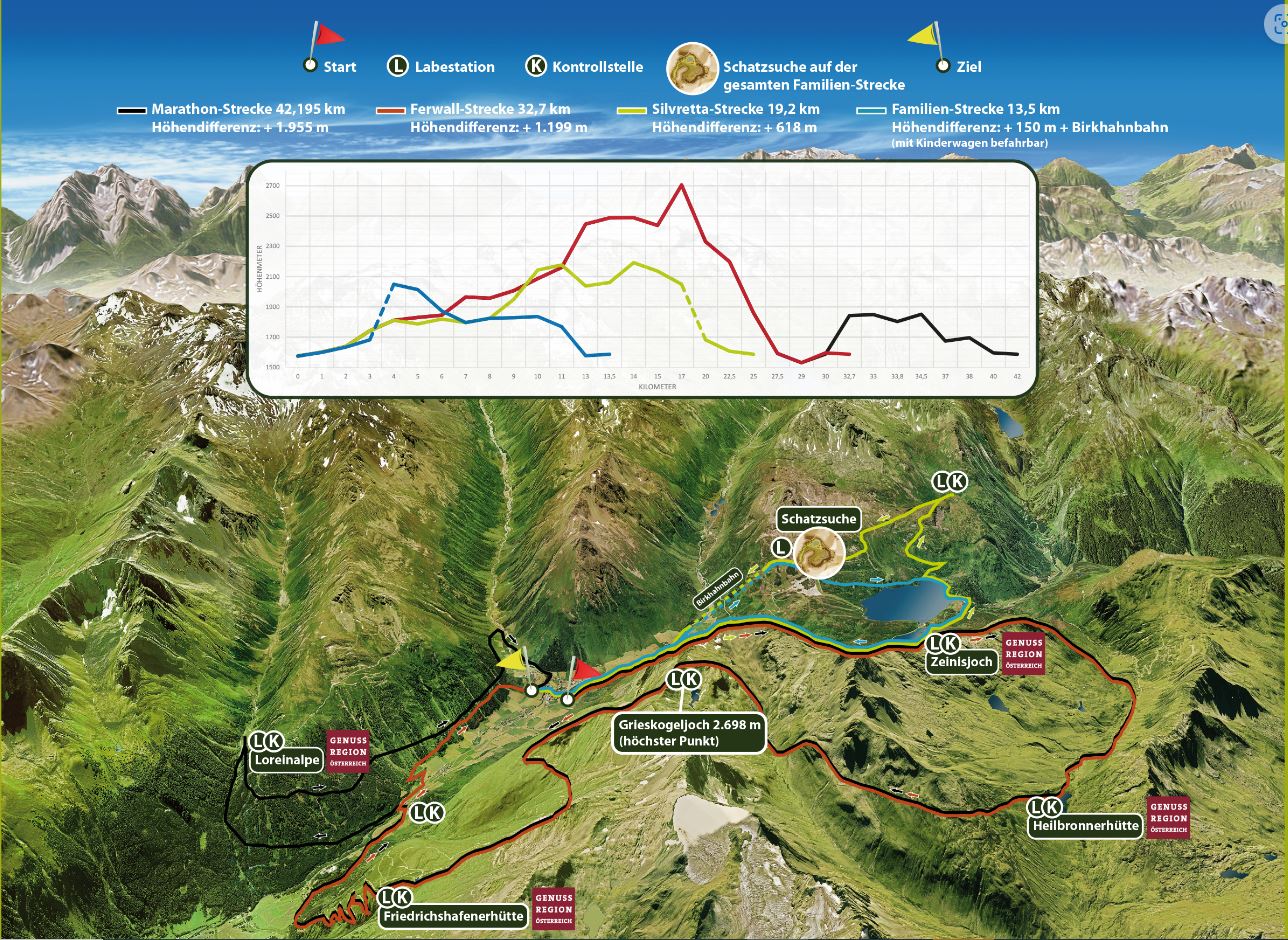 Von Galtür nach Wirl, über das Zeinisjoch, vorbei an der Verbella Alpe bis zur Heilbronner Hütte. Dann über das 2.698 Meter hoch gelegene Grieskogeljoch zur Friedrichshafner Hütte. Abstieg nach Tschafein und entlang des Wanderwegs zur LareinAalpe. Von dort aus führt der Weg über den Höhenweg direkt ins Ziel.