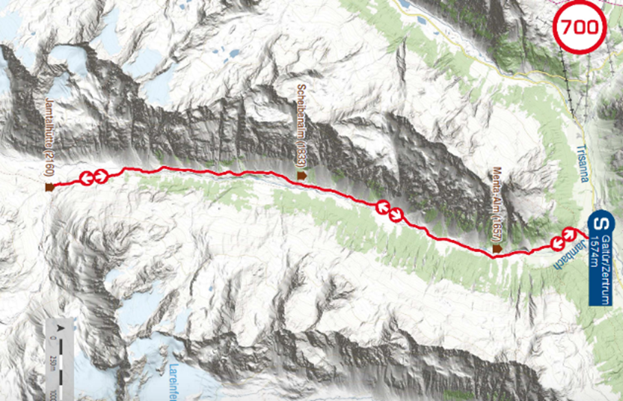 Vom Zentrum aus erreicht man die Hütte nach 10km durch das Jamtal. Begleitet wird die Tour durch fantastische Ausblicke auf die vergletscherten Gipfel. Auf dem Weg liegen zwei bewirtschaftete Almen, die für kleine Pausen einladen.