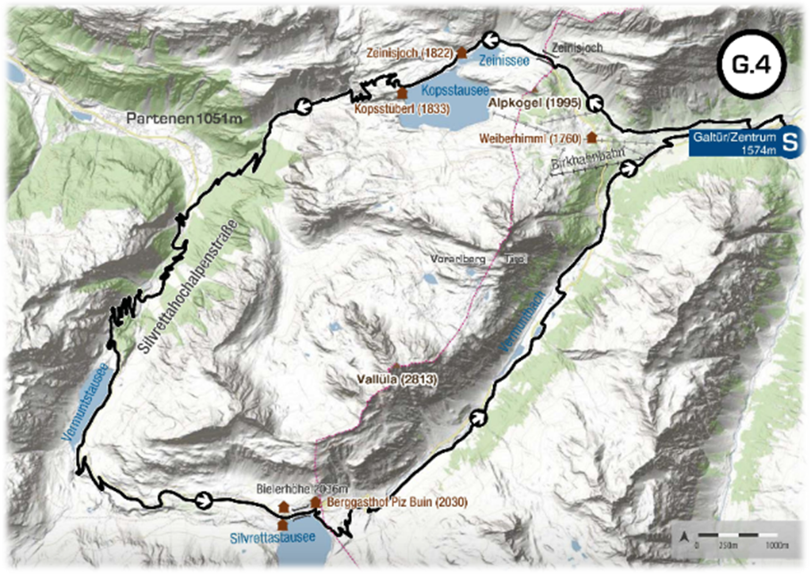 Hier hat man den höchsten Punkt auf 2036m erreicht und kann beruhigt im Gasthaus Piz Buin einkehren, denn ab hier geht es nur mehr nach unten