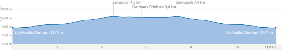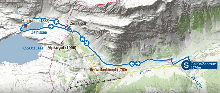 Abwechselnd auf Asphalt und Schotter erreicht man vom Zentrum aus nach etwa 4,5km den Grenzübergang zwischen Tirol und Vorarlberg. Um den Zeinissee herum, am Gasthof Zeinisjoch vorbei geht es auf der asphaltierten Straße wieder zurück.